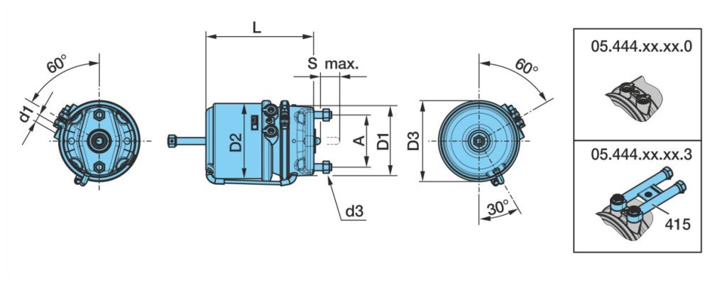 A 120,7 для полурессоры, внизу d1 M16x1,5 D1 163 D2 174 D3 186 L 249 s max. 65 Применение Оси прицепов BPW с дисковым тормозным механизмом мембрана/поршень