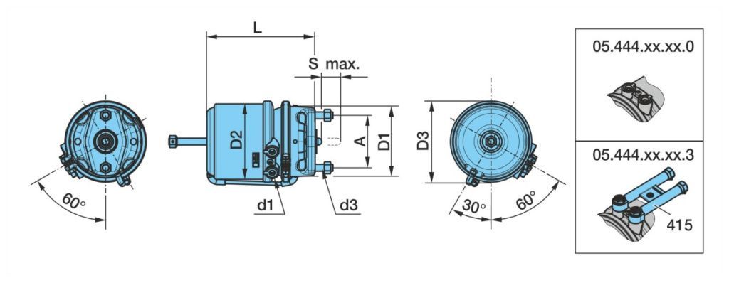 0544446030 BPW A 120,7 для полурессоры, вверху d1 M16x1,5 D1 163 D2 174 D3 186 L 249 s max. 65 Применение Оси прицепов BPW с дисковым тормозным механизмом мембрана/поршень  по запросу от 2-х дней по запросу